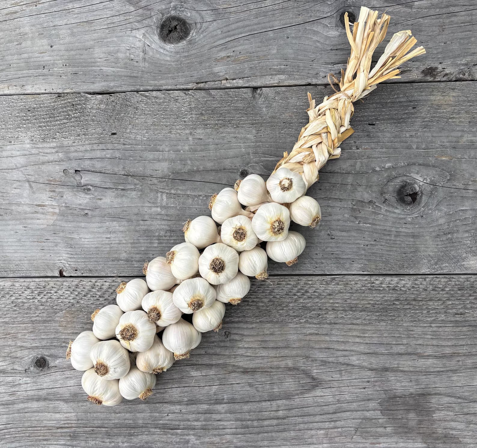 Locally grown, soft-neck garlic, hand-braided for freshness and flavor.