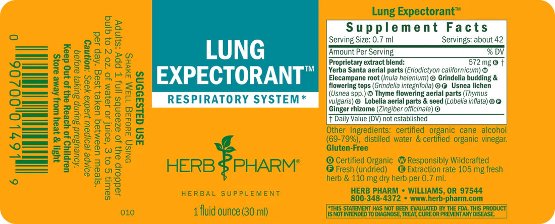 Our Lung Expectorant features Elecampane extract prepared from the root of Inula helenium plants. It also includes Lobelia extract made from the fresh aerial parts and seed of Lobelia inflata plants. We grow both plants on our own Certified Organic farms in southern Oregon.